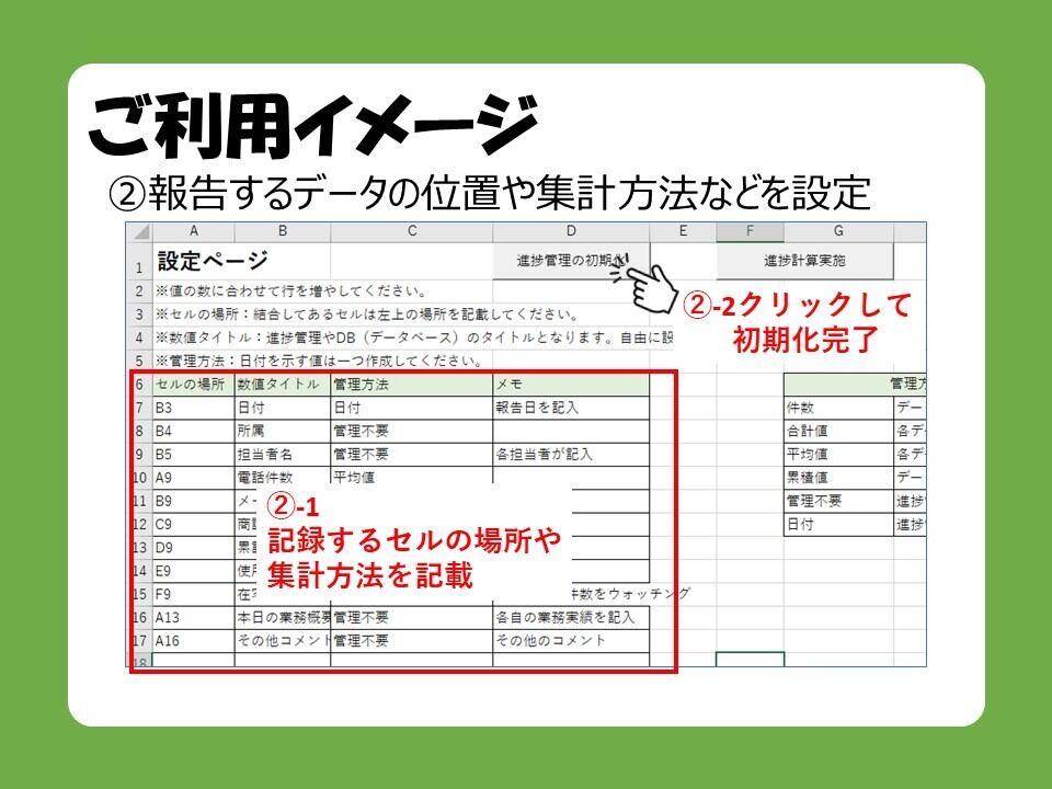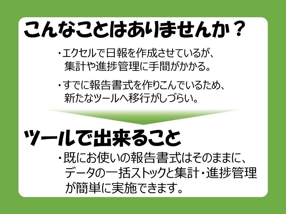 □エクセルで日報などを報告し、簡単に進捗管理ができるツールです。