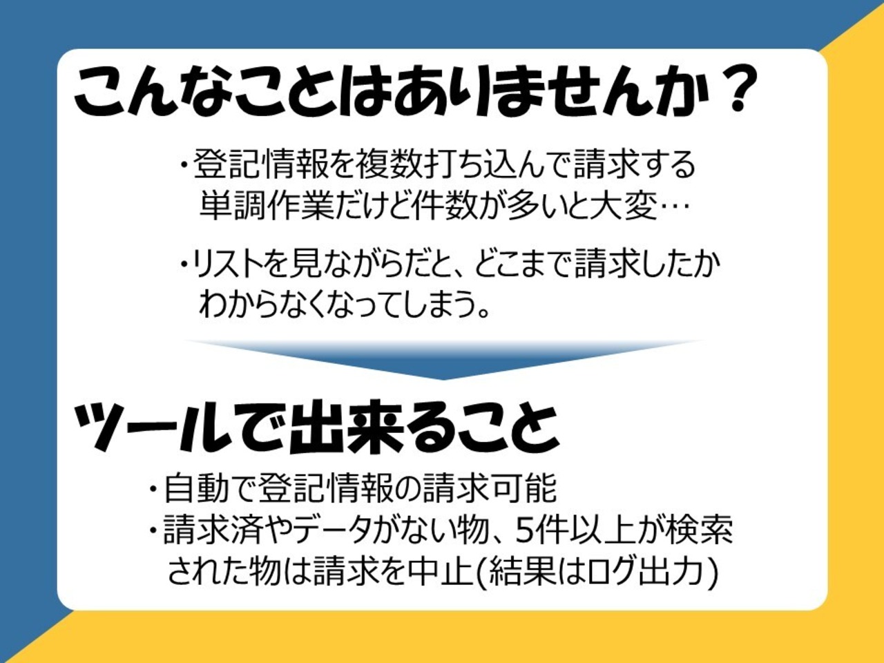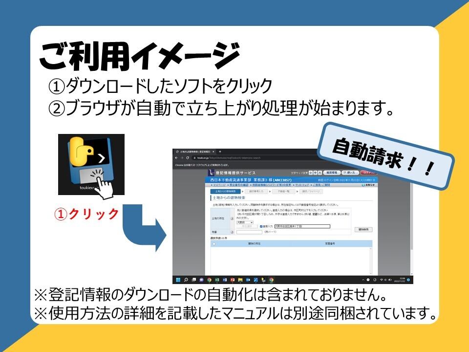 □登記情報提供サービスから、登記情報の全部事項を請求するツールです。
